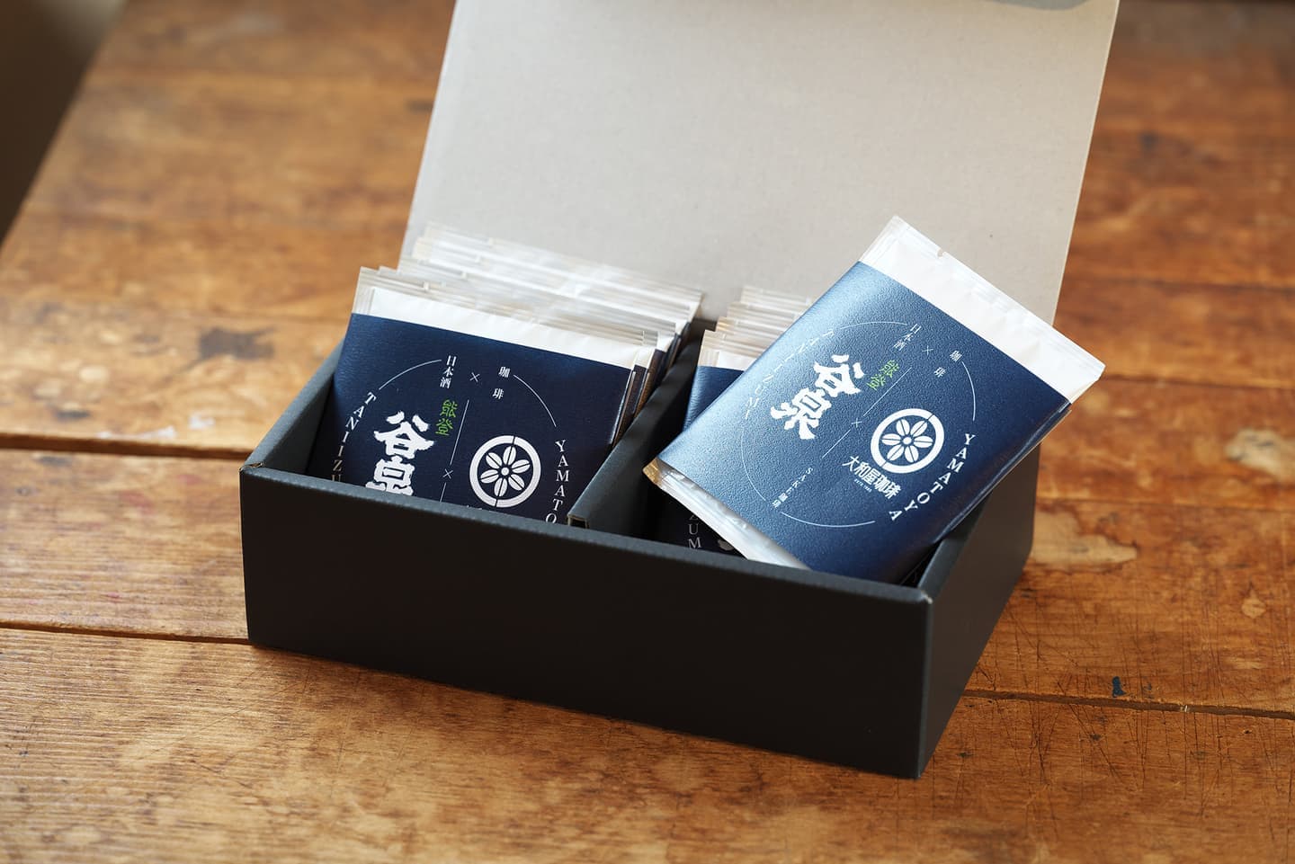 水ですすぎ洗いした綺麗な「生豆(ブラジル)」を鶴野酒造の「谷泉」に漬け、次に一定時間漬け込んだ豆を取り出し、規定の水分量まで乾燥させます。その後、熟練の焙煎士が丁寧に焙煎した後、選別、粉砕しドリップパックに加工しました。香りと味を封じ込めたオリジナル「SAKE珈琲」をお楽しみください。
